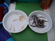 エサは冷凍小ハゼ、冷凍イサザ、魚の切り身などが配られます。