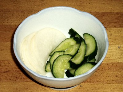 冷酒とお新香(大根とキュウリ)、いいですなぁ〜。